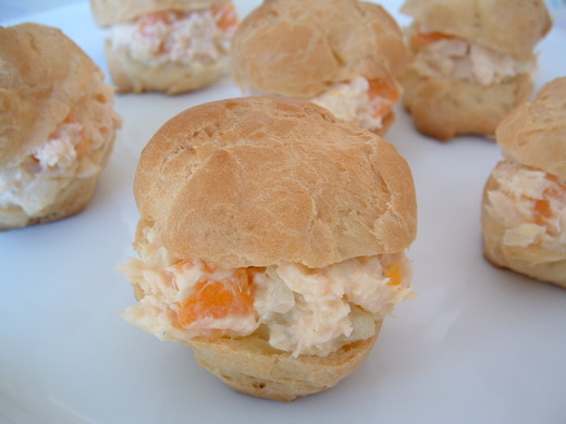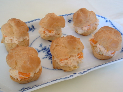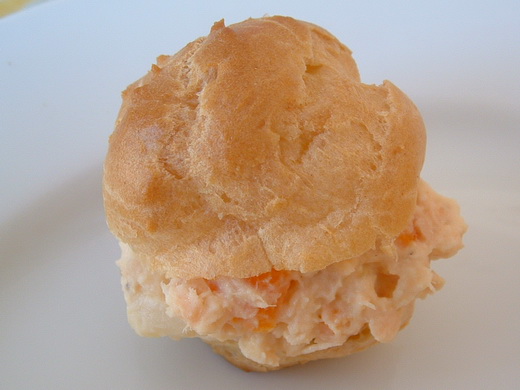 - 泡芙從中間切開﹐夾鮭魚沙拉餡。(泡芙食譜請看 奶油泡芙和香草布丁)