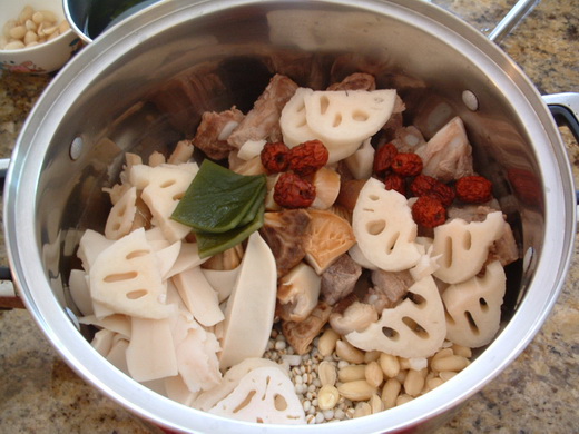 - 蓮藕去皮切¼吋(0.6公分)厚片﹔香菇泡軟﹐切大塊﹔紅棗、薏仁、花生、海帶分別泡水﹐沖洗乾淨﹔玉鮑切薄片﹔干貝洗淨﹐放在飯碗裡加水﹐泡軟。