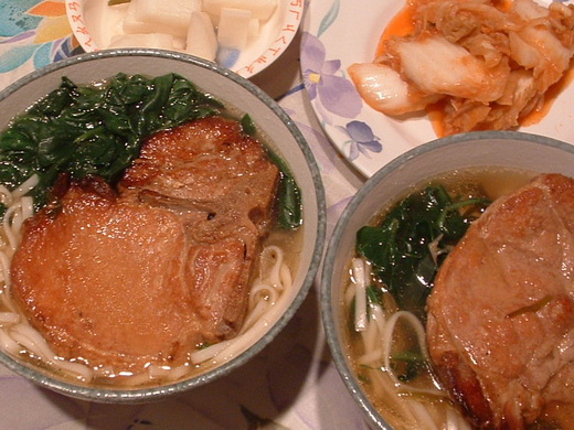 這道蔥薑燉大排骨肉是學自囡囡仔家的蔥烤大排麵(見無可救藥的東方胃 )。排骨炸半熟後再加蔥薑等調味料燉熟。燉好掀開鍋蓋﹐一陣異香撲鼻。那一小半鍋湯汁﹐看起來清澈見底﹐滋味卻可媲美香醇的紅燒牛肉汁。排骨肉軟嫩有味﹐下麵下飯都好。