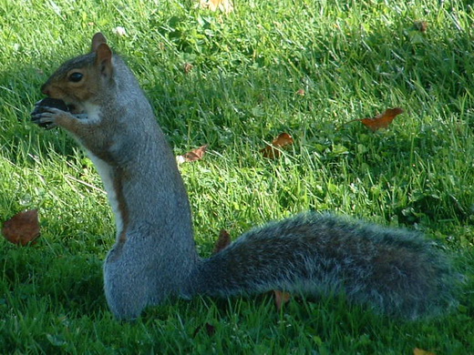 今天看到一隻松鼠在草地上挖東西﹐頭埋在草裡﹐前腳拚命挖﹐挖出來一顆漆黑的松果﹐牠站起來﹐雙手抱住松果往嘴邊送。以為牠在吃果子﹐結果並不是﹐牠只是一口一口舔﹐似乎在清除泥土。舔了一會兒後﹐跳來跳去﹐找到一處有陽光的地方﹐再把松果埋進泥土裡。
