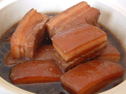 - 在瓦斯爐上煮一小鍋水﹐將五花肉整塊入滾水燙煮5分鐘﹐取出來﹐用清水沖洗﹐摔乾水份﹔