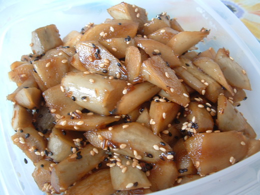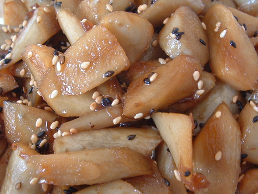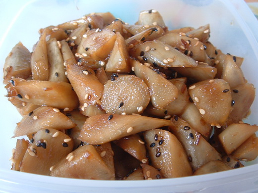 常看到的涼拌牛蒡都是切細長條或絲狀﹐這天看到這個食譜切成滾刀塊﹐覺得很特別﹐便嘗試一下﹐結果出奇好吃﹐入口清脆爽快﹐趕緊整理食譜﹐與大家分享。查看網上資料﹐有人稱它東洋參﹐其營養價值之高﹐直可媲美人參。