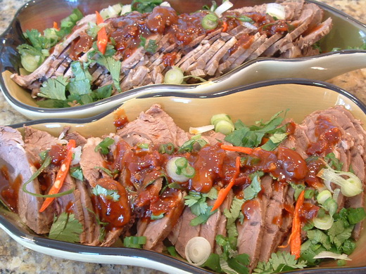 - 冰涼的牛腱先順肉紋切成兩半﹐每一半再逆肉紋切大薄片﹔辣椒切絲﹐香菜去梗切碎﹔