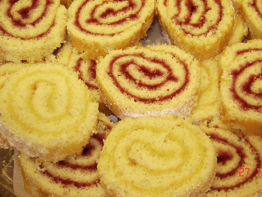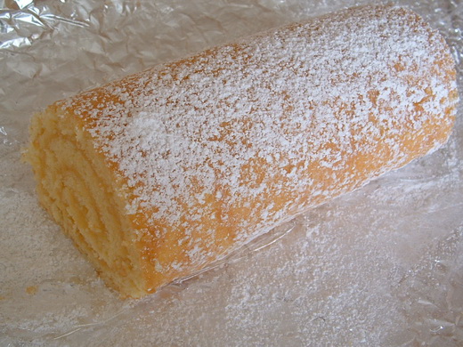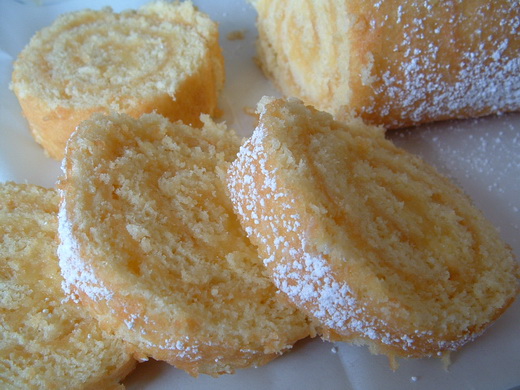 烤好後捲起來的步驟看起來很麻煩﹐但其實很有趣。我已經一做再做﹐愛上了它。尤其檸檬醬內餡的蛋卷﹐色澤清爽﹔酸酸的檸檬捲進甜甜的蛋糕中﹐二者相得益彰。
