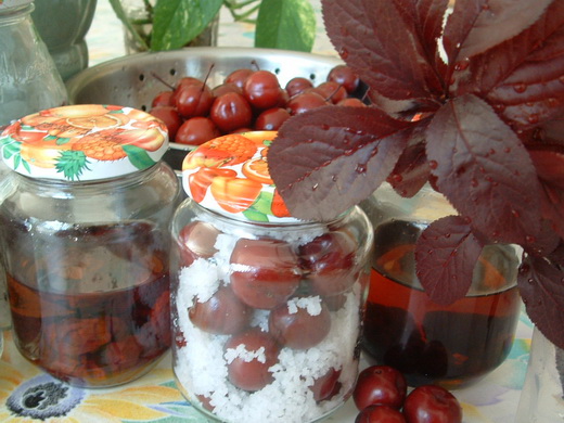 將果實洗淨,擺在盆裡晾乾。果醬瓶用滾水煮過,再晾乾。準備一小碗粗鹽,一層果實一層鹽地填滿果醬瓶,然後封蓋,擺在陰涼的角落,殷殷等待白色海鹽化為晶瑩剔透的瑪瑙色汁液,沉浸一年才得來珍貴的半瓶精髓。一年後打開瓶蓋,如新釀美酒,微妙幾滴可令味蕾陶醉,為我調配沙拉醬的秘密元素。