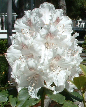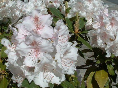 我的花只查了一半﹐看起來像是屬於杜鵑花科﹐花的形狀像杜鵑花﹐但是葉子怎麼會長這麼大呢﹖杜鵑花會長得像一棵小樹嗎﹖電腦還在生病﹐不敢隨便亂查﹐就乖乖的用杜鵑花的英文名 Rhododendron 搜索影像﹐找到十九萬九千個影像﹐小心翼翼看下去﹐只進 org 和 edu 網站﹐這次運氣很好﹐很快在北卡羅來納原生野生植物網站看到美麗的杜鵑花樹。原來它就叫大杜鵑花(Great Rhododendron)﹐拉丁學名是 Rhododendron maximum﹐真的屬於杜鵑花科(Ericaceae)。