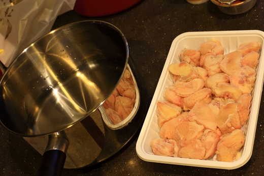 拿出我愛用的丫基師牌的平底鍋,洗乾淨不加任何一滴油,雞屁股倒下去,蓋上鍋蓋就開火準備讓它們自己煎,過不一會,可以看到平底鍋上開始冒油啦!這可是正港的雞油,大概是因為我想要炸出更多的油而不想吃進肚子裡,結果,雞屁股就縮水了! 哈哈