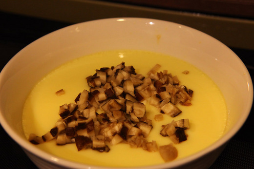 從冷凍庫裡抓一顆大香菇出來切碎,等這蒸蛋一做好,再擺上去再微波三分鐘,一個滑嫩嫩的蒸蛋就好了囉!