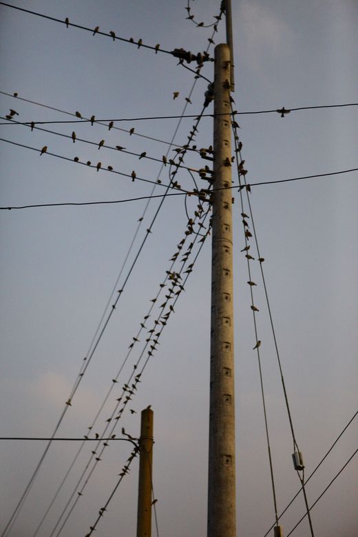 開了一小時就到外公家了,把車先停好後,外婆說外公要放炮轟鳥,於是我帶亮亮走路去找外公,看到外公的米稻田結穗快要成熟了,一大群的麻雀就這麼停在電線桿上,伺機而動又虎視眈眈直盯著我外公的田。
