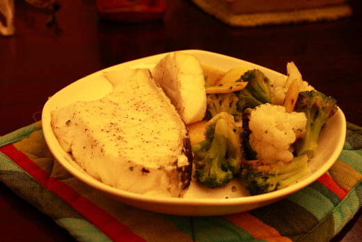 好市多的圓鱈有兩種,斜切的是適合蒸煮,有刺、膠質很多;今天吃的這種切片是適合烤、煎,肉質比較 Q也很甜。撒點黑胡椒在上頭就跟牛小排進去烤箱烤了~~