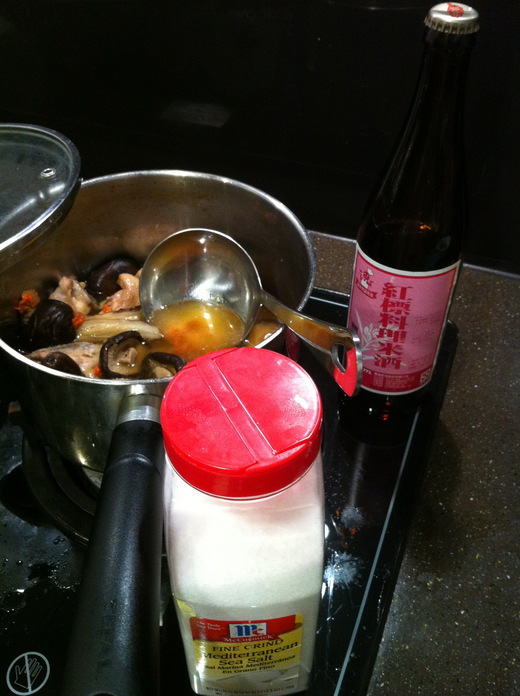 水滾後我通常會再多悶煮個十來分鐘,打開鍋蓋、撲鼻而來的陣陣香氣,下個米酒、鹽巴,再多悶一會才熄火,但此時還不能急著打開鍋蓋,蔘片要多悶一會才能釋放出味道。