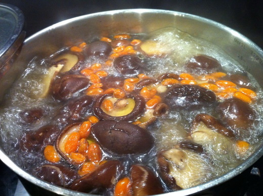 首先把雞肉過水,再用冷水沖洗;接著裝個水連同枸杞、黃耆、蔘片先一起熬煮,等滾了後就能把雞肉、香菇丟入。我家沒有紅棗了,下回要去補貨!