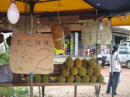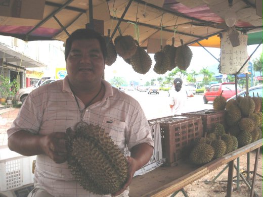 (我的榴槤「處女食」就在這家水果攤進行。攤販老闆可真以他上好的榴槤為榮。)