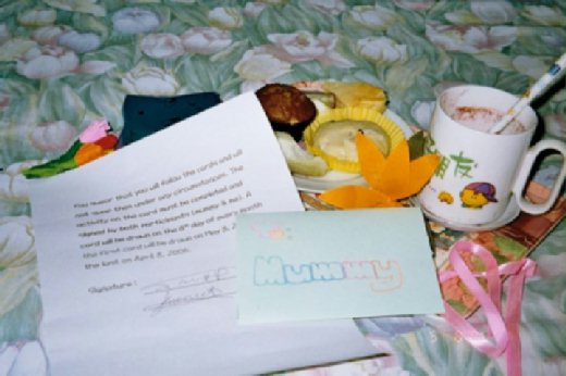 正準備下床,小旦小就端了一托盤的東西進來,送到媽咪床上,拖盤上有媽咪的早餐,還有小女兒送的母親節禮物。