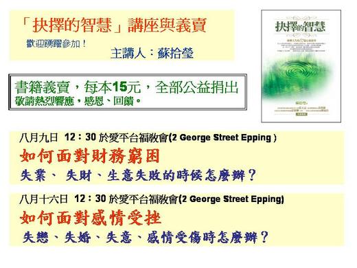 來自台灣的女作家蘇拾瑩女士將於本週日及下週日舉辦「抉擇的智慧」感恩演講並義賣捐獻回饋活動,將於八月九日與十六日星期日的中午12:30,於2 George Street Epping的愛平台福教會舉行。