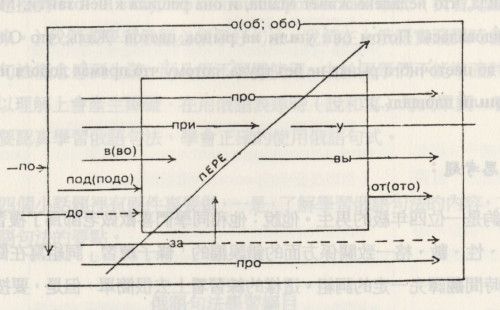 圖當中的俄文字都是前綴, 前綴加上定向運動動詞, 就成為完成體動詞, 而運動動詞共有... (不寫就代表他不存在) ... 組, 跑, 走, 跳, 游泳, 滾...等都是運動動詞, 這些動作也都有成對的定向與不定向的型態.