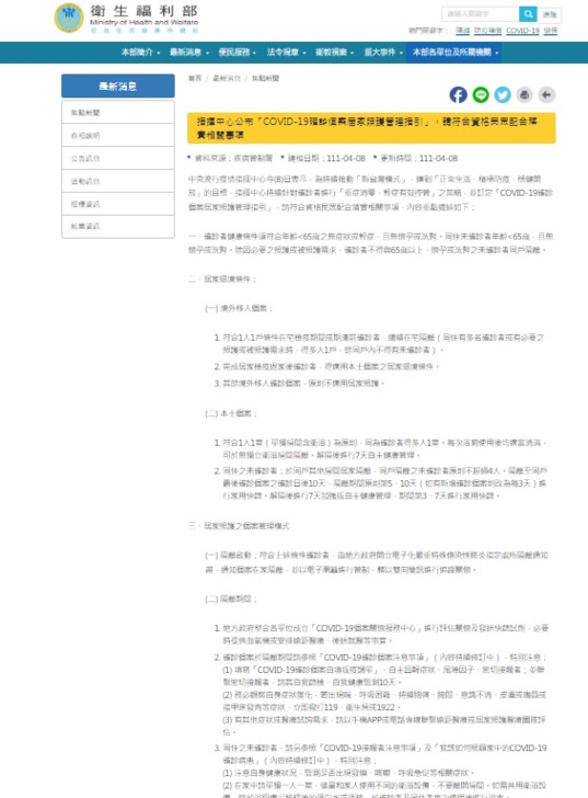 2022年1月1日的「居家隔離、檢疫或自主健康管理者接受醫療照護時之感染管制措施」
