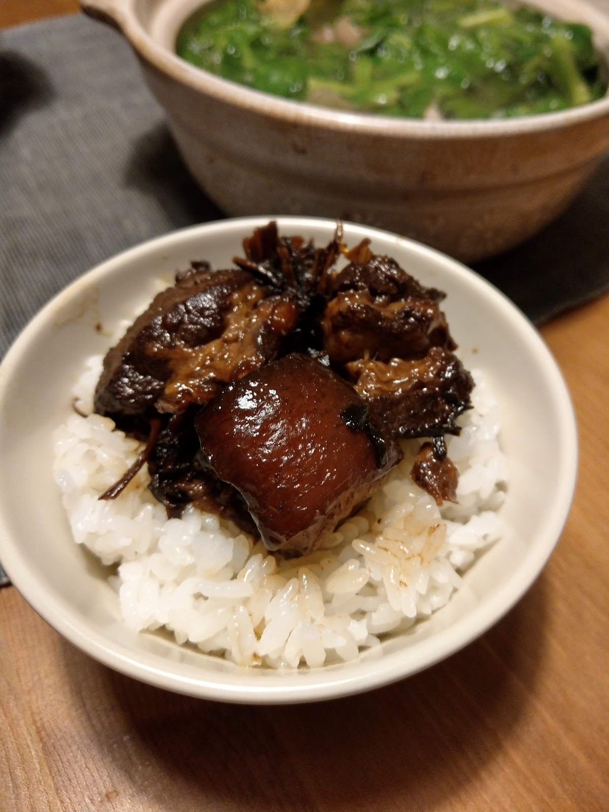 可以放一個八角,這大約燒個一小時到一小時半。中間隨時調整味道,放糖放酒放醬油。最後收汁。