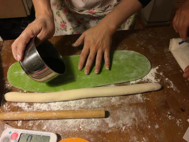 之後白色麵團揉成條。綠色麵團撖成片,包住白色麵團。成型之後切塊,用手壓平撖成餃子皮。一個皮大約是二十公克。