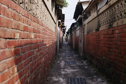 一騎進去此眷村的巷道約4米寬,除了右邊有一自治會和議員的辦公室,沿路看,果然不是每戶都有人住,看到的大部份是一樓的平房,5戶有3至4戶不是鐵門放下,便是大門深鎖,往裡面瞧是覷黑無人跡;或有的大門開啟,看得到裡面的雜物;有些店面雖然招牌還在,但看起來是不再營業的模樣。