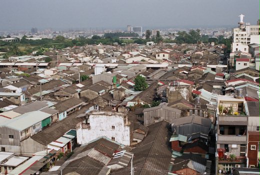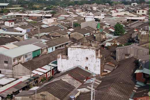 為了捕捉精忠三村的鳥瞰圖,雖然第一次被拒,第二次遲疑,第三次終於被大方開門叫我自己上去,而來到一7層建物的頂樓。往北方看,精忠三村眷村在前,後面較遠方是大樓環伺,頗似現在都市計劃對這方正大塊的覬覦;往東看,精忠三村在前,後面拉遠模糊,可像眷村的未來? 我興奮又緊張的在這無遮無圍平台待了十多分鐘,補捉我所要的意象,這也對此次精忠三村紀行的旅程給了很大鼓舞。