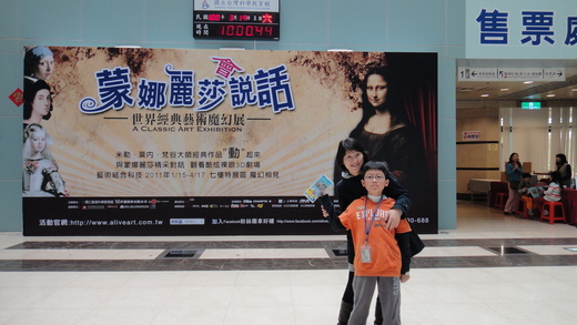 一早搭捷運到"劍潭站"搭接駁車到科教館看~蒙娜麗莎會說話~世界經典藝術魔幻展9:30分的接駁車,早已排成長長的人龍....不過大家很守秩序.這個特展有優待國小學童,只要到全家拿圖畫紙並著色,則可免費看展喔!