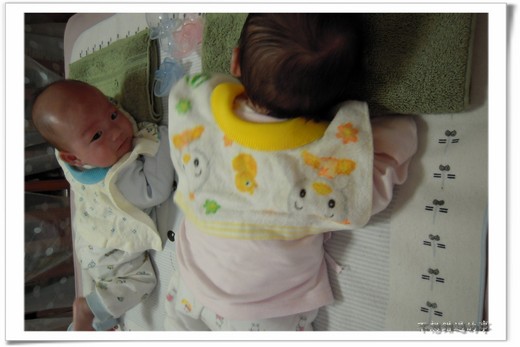雖然出生時兔比蝦重,但歷經肺部吸入羊水及黃疸照光治療,出生後的體重下降速度比蝦快,喝奶的狀況也略遜於蝦,之後也不像蝦每天的體重都穩定成長,成為女生和妹妹該有的比哥哥嬌小的狀態。滿月後兩人奶量逐漸調到相同,然而男生還是顯得較大隻,OK的。未滿月前蝦已會咧嘴笑,兔會微笑。
