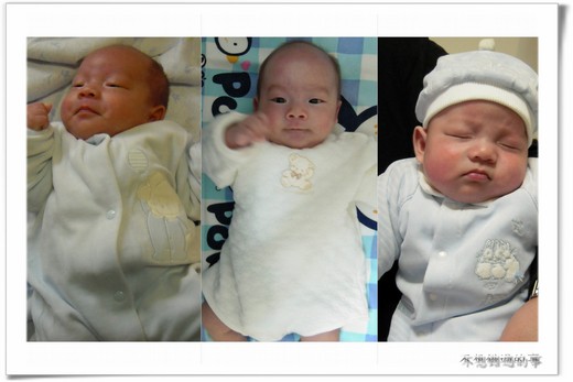 細細觀察你的眉眼,但覺你非常清秀,卻說不出長得像誰。可能在肚子裡時你的頭在下方被擠壓,你又愛把頭歪向一邊,我一度以為你的臉是歪一邊的,幸好不久後就日漸端正起來。很多人都告訴媽媽:「你兒子以後一定很帥喔。」只是你老愛擠出一堆抬頭紋,張著圓圓的大眼睛,像個小老頭似的搖頭晃腦。直到滿月前慢慢養出肉來,你終於返老還童,有張可愛的嬰兒臉。