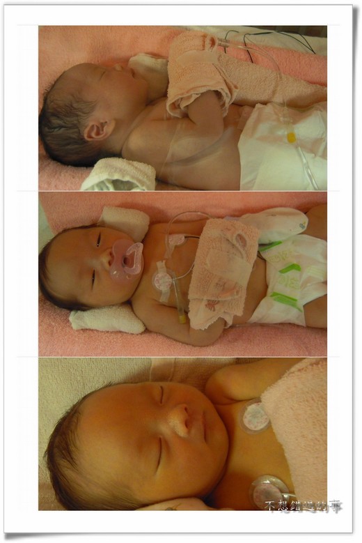 第一次去加護病房看你時,你包著尿布待在保溫箱裡,身上貼滿點滴和各種儀器。雙手分別纒上毛巾和手套,手腳不斷揮舞,嬌弱無助的模樣,讓媽媽不禁鼻酸。爸爸輕聲地和你說話,要你加油。我們不能親手抱到你,但在心裡緊緊擁抱著你。一開始你還需要給予氧氣,時睡時醒,可能因為身體不適,醒來後無法保持安靜,常常會大聲哭鬧,你的哭聲和儀器的警示聲,令我們和你一樣無助。