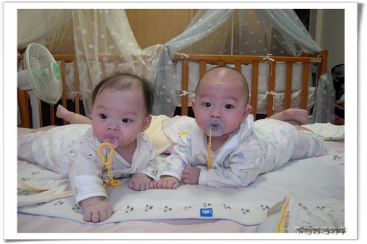 日漸長大的蝦兔非常愛玩,雖然還算聽話地待在自己的嬰兒床,但感覺得到一直想翻滾身體、舞動手腳之類的欲望。打算近日內在客廳圍個區域,白天讓他們在裡面玩耍,空間比較大,否則蝦蝦老是將手腳伸出床外,弄得四肢傷痕累累也不是辦法,男生真的是很好動啊。所以蝦蝦才會四個月就開始有小男生的臭味,兔兔則有女孩兒的甜香味,男女有別呀,真妙。
