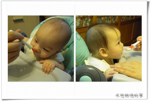 蝦兔已九個多月大了,蝦蝦七個月長牙,現在有三顆牙,兔兔第一顆牙比蝦慢長二十幾天,現在第三顆即將冒頭,咬到會痛了呢。副食品階段進行了三個多月,主食以調成糊狀的米麥精為主,再配上牛奶;點心有水果泥、蔬菜泥、有機豆腐、果汁、嬰兒米餅等輪流替換。正餐三次,點心一到二次。