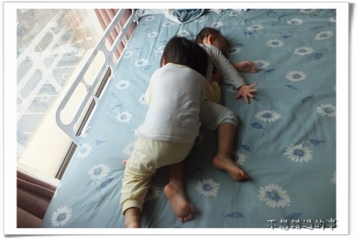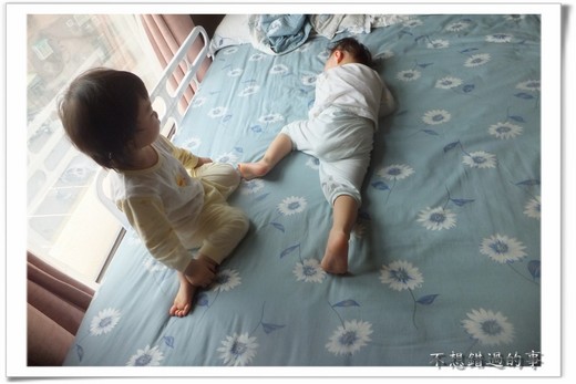 眼下蝦蝦不肯離開媽媽的懷抱,我只好抱著他半躺臥在床上,看著兔兔在床邊自己玩,沒一會,懷裡的抽泣聲停了,一看,咦?不會吧,快吃午餐了耶,蝦怎麼這時睡著了?兔兔貪吃,蝦蝦好睡,但他是全家作息最正常的人,晚上九點睡,早上七點多起床,午飯後再睡一個半小時至兩小時,除非真的特別累或太無聊,還不至於亂睡,現在這是什麼情況?我把他放在床上,和妹妹一起叫他名字,毫不回應。