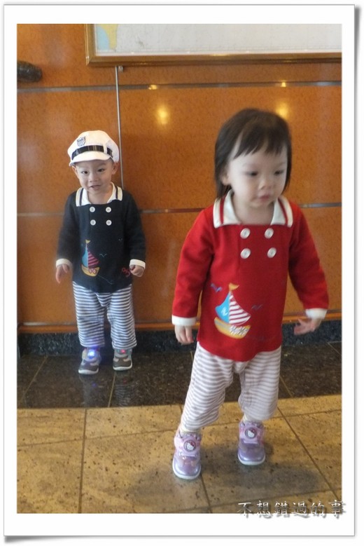 出關後要登船的短暫路程上,有裝扮成卡通人物與街頭藝人的船員歡迎旅客,蝦蝦上船前就被一隻企鵝人偶嚇哭,呵呵。上船後先抵達五樓房間,放妥行李及簡單梳洗,便上九樓王朝餐廳吃下午茶,後到甲板上享受日光浴。蝦兔第一次看到海顯得特別興奮,回到房間兩兄妹索性將臉貼在窗前看海,一般喊者海一邊手舞足蹈,真不知他們到底是懂還是不懂。