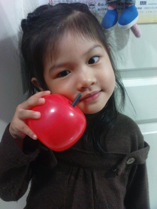 這是前天和同事去吃鬍鬚張吃飯,吃完之後在門口發現有很多"蘋果氣球"二話不說,當然是問店員能不能給我一個,有很多顏色,我要了一個紅色的,打算帶回家給我的小幸韻禮物呢!