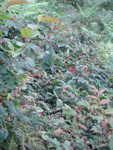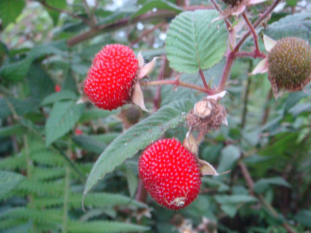 午後出發,天氣並不怎麼好,天空沉甸甸的,灰白的色調,空氣中夾雜著濕濕黏黏感覺,我的心情一點不受影響,和好友全副武裝帶齊裝備,驅車上山摘竹筍,車抵桂竹林邊,下了車,我被眼前的景象震住了,一整片的「紅莓果」,不,正確的說應該是刺莓,這紅艷艷的、 晶瑩剔透、酸甜的鄉間美味,頓時讓我口腔的唾液分泌急速增加,快速的摘了一顆放入口中,那滋味美極,許是海拔較高關係,竟一點酸味也沒。