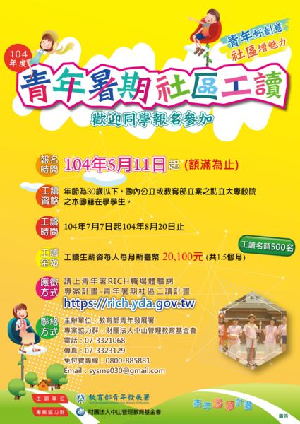 【徵才】教育部青年發展署「104年度青年暑期社區工讀計畫」歡迎踴躍投遞履歷!