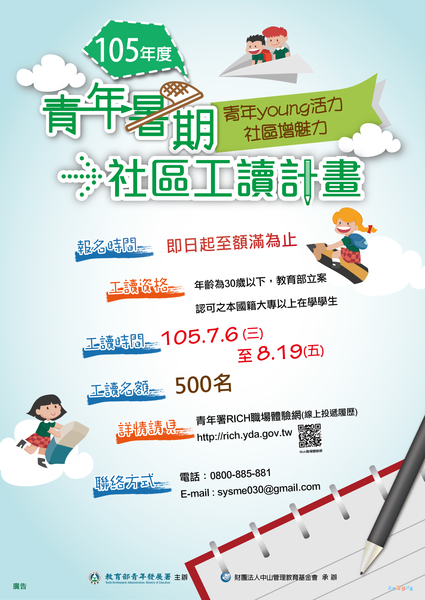 「105年度青年暑期社區工讀計畫」開放應徵囉~! ~暑假~要到囉! 暑假行程安排好了嗎? 想趁暑期賺零用錢,卻又怕誤入陷阱嗎? 教育部青年署為讓青年了解職場、及早規劃職涯,提供大專院校學生多元職缺和優...