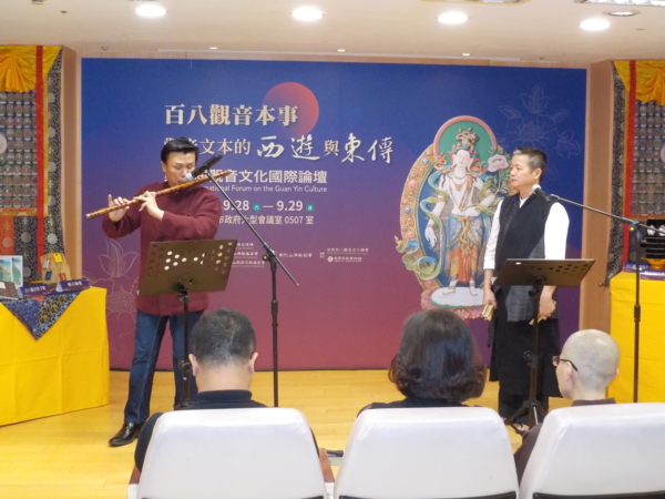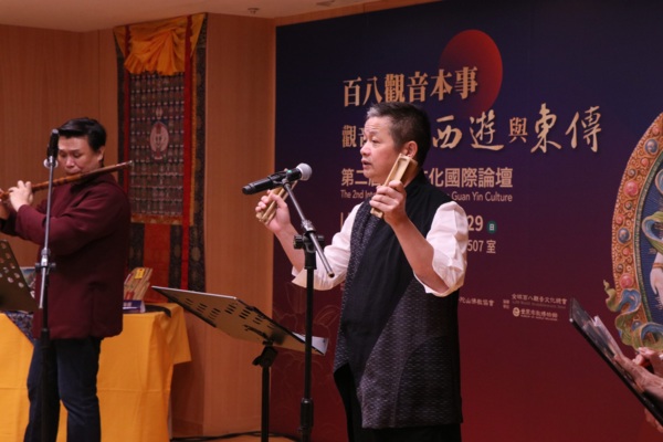 台灣知名的劇作家及戲曲演唱家游源鏗(右),搭配竹笛演奏家黃殷鐘,以感人的吟唱《心經》開場,用演歌音樂形式介紹觀音,展現佛教音樂的無窮魅力。(圖由靈鷲山佛教教團提供)