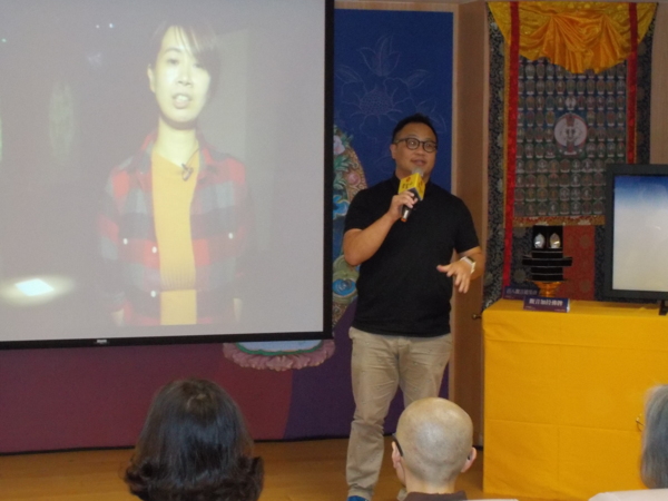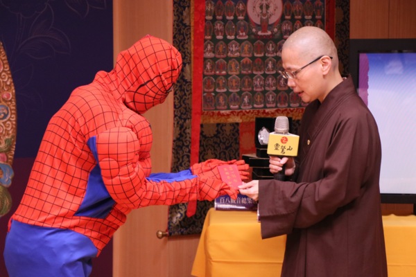 蜘蛛人抽完電子觀音籤後,由靈鷲山廣純法師解籤、指點迷津,並結緣「豬年祈福卡」。(圖由靈鷲山佛教教團提供)