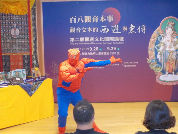 當若科技藝術共同創辦人周杰璁、台灣知名的劇作家及戲曲演唱家游源鏗、新北市民政局主任秘書陳怡君、靈鷲山宗委法師釋廣純、全球百八觀音文化總會會長陳國寧、靈鷲山護法總會副總會長何語(由左至右),與蜘蛛人一起合影,邀約民眾參加第二屆觀音文化國際論壇。(圖由靈鷲山佛教教團提供)