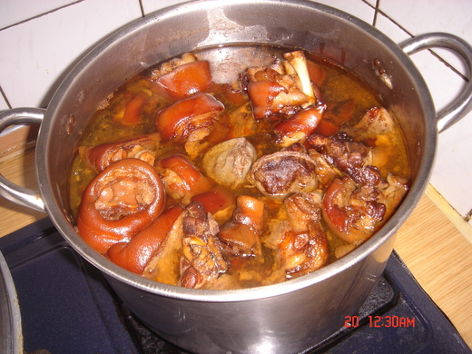 出門前,老媽有點擔心的說:今天早上太晚打開鍋蓋了,豬腳可能會太熟,可能不太好吃.聽了老她的話,我不是很耽心豬腳好不好吃,整鍋的豬腳可說是老媽疼我的表現哦!我也對老媽的手藝充滿信心,豬腳一定會被大家吃光光的