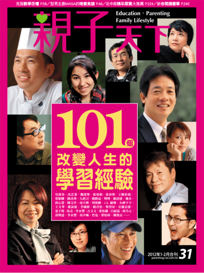 親子天下1-2月合刊;蒐集101個人物的故事來提供孩子自我學習的多元榜樣;這些故事也可以當作父母教養孩子的參考,由這些故事主編歸納出要能啟發孩子學習動機的關鍵因素是:「參與」、「樂趣」、「自信」,或許正如月刊篇名:「在別人的故事,找到自己的功課」,我就利用春節假期,到7-11翻翻這期月刊,看看別人學習經驗,反省自己學習之盲點!