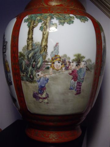 乾隆紅釉描金粉彩嬰戲圖長頸瓶