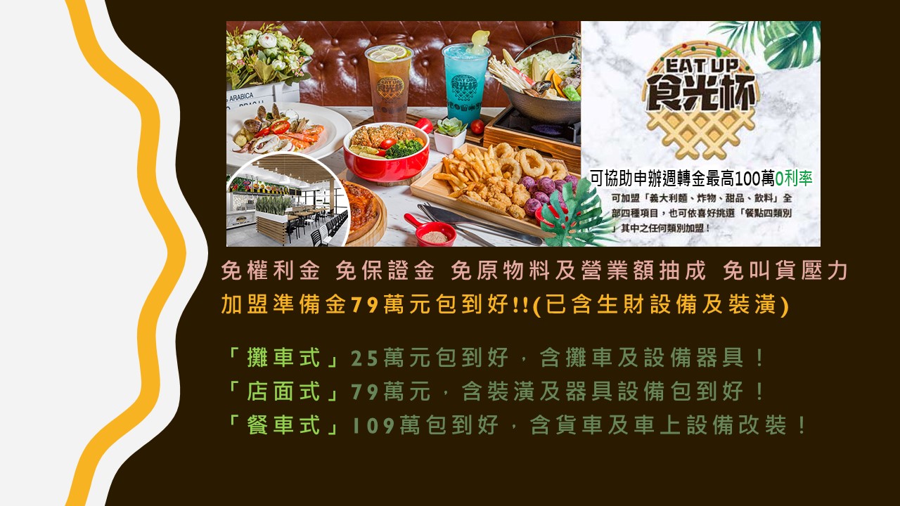 具有獨家全臺首創餐點與合格原物料工廠,無餐飲經驗也能輕易上手,專業團隊與教育訓練,外行人也能變大廚,淨利毛利率高快速回本,小資創業小額投資,最佳首選品牌。