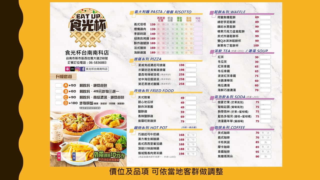 ● 食光杯複合式餐飲為客製化加盟體系,有別於一般品牌固定框架,讓您開一間自己喜愛的裝潢風格,以及自行決策需要賣的種類,不強迫賣所有品項,例如可將油炸類改為其他烹煮方式的餐點品項,依您需求及地點客製化適合當地的菜單及售價,將與加盟主討論分析販賣各個類別優勢再做出決策。
