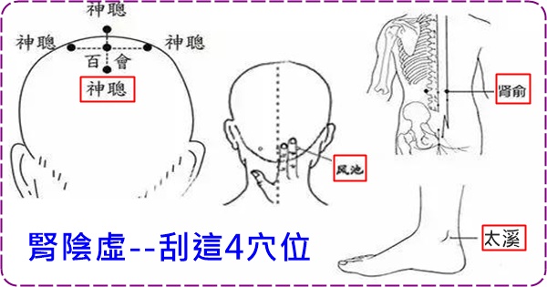 刮拭順序:先點按四神聰,再刮後頭部風池,然後刮背部腎俞,最後刮太谿穴。
