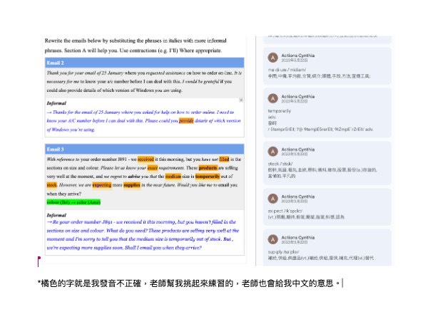易森語言的「互動白板」功能也讓我非常驚艷。它就像一個能同步編輯的Google文件,老師可以在上面即時標註我的錯誤,修改我的用詞,而且教材內容也能直接在上面做筆記。這樣一來,「課後筆記一目了然」,我不用再像以前一樣,課後還要花時間整理凌亂的筆記,直接打開白板就能複習,真的幫我省下了不少時間。更重要的是,一堂課有「50 分鐘」,足足比Engoo多了一倍時間,這讓老師有足夠的時間進行深入講解、練習和模擬,而不是草草結束。雖然系統沒有內建錄影功能,但易森語言會提供兩款錄影軟體,可以自己錄下來回顧老師的講解和我的口語表現,我覺得這樣搭配下來,整體「線上英文 CP 值」超高。