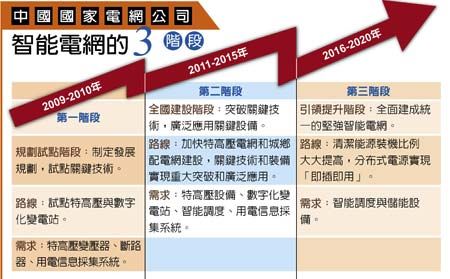中國相較於其他國家,在智能電網的推動方向較為不同。中國國家電網公司於2009年5月提出建設強智能電網三個階段。2009-2010年是第一階段,先制定發展規劃,試點關鍵技術;2011-2015年是第二階段,進入全國建設階段,將突破關鍵技術,廣泛應用關鍵設備;2016-2020年是第三階段,將全面建成統一的堅強智能電網。