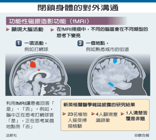 研究報告的共同作者、英國醫學研究委員會的歐文說,掃描結果除了告訴我們這名病患不是植物人外,更重要的是,5年來第一次,這名病患有了向外界傳達想法的溝通管道。