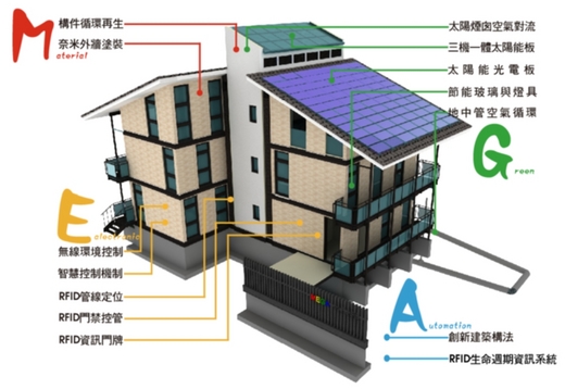 為能突破國內傳統產業與高科技產業的整合應用瓶頸,在傳統之建築領域範圍,導入破壞式創新的精神,由舒適安全居住空間、永續節能環境,及人文感動關懷之需求議題切入,利用來自大自然及老祖宗給我們的智慧及啟示,如融合自然界光、水、風、植物於建築的材料、構件(水泥板、鐵件、玻璃)及本體空間中,並思考如何導入本土創新及再利用的材料及構件,環保節能、感測控制等高科技設備強項,並以台灣地區建築型態之內外實體與空間為一整合應用平台,帶動建築與營建領域可實際應用之跨領域研發,達到傳統產業與高科技產業結合的效用。